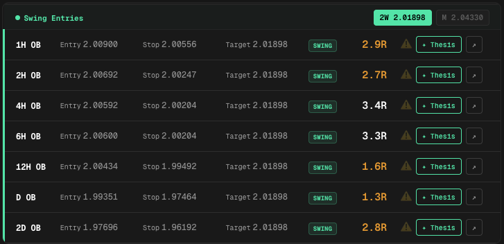 R:R calculated to every structural target automatically
